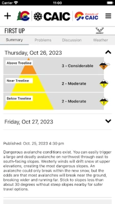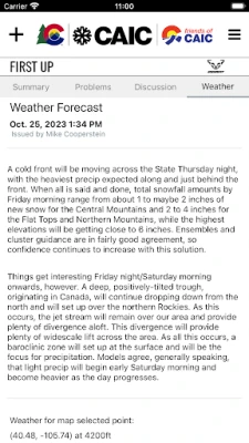 Colorado Avalanche Info erbjuder aktuella lavinprognoser för Colorados berg direkt i din mobil. Se prognossammanfattningar, diskussioner, aktuella lavinproblem och bergsväder. Du kan också skicka in observationer direkt till Colorado Avalanche Information Center (CAIC) för att bidra till en säkrare bergsmiljö.