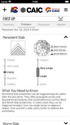 Med CAIC får du en omfattande överblick som sträcker sig bortom det grundläggande. Varje prognos innefattar en koncis sammanfattning för snabb förståelse, följt av djupgående diskussioner som belyser de bakomliggande faktorerna och riskbedömningarna. Utforska detaljer om aktuella lavinproblem, vilket tydligt identifierar potentiella faror och utmaningar. Dessutom presenteras en komplett bergväderprognos, så att du kan förbereda dig för de ständigt skiftande förhållandena högt uppe i terrängen. Allt detta samlas för att ge dig en helhetsbild av de alpina förutsättningarna, direkt i din hand.