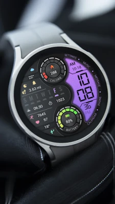 Anpassningsmöjligheterna är centrala i denna urtavlas design. Välj precis den information som är viktigast för dig med flexibla datavisningar. På den vänstra sidan kan du konfigurera visning av anpassad data, genvägar till appar, avståndsloggar, veckans steg och din aktuella hjärtfrekvens. Mittsektionen är dedikerad åt att visuellt visa dina kalorier och deras procentuella framsteg, samt batteristatusen med dess utveckling. Till höger finner du grundläggande men essentiella funktioner som AM/PM-indikator, datum, tid, samt direktåtkomst till inställningar, musikreglage, meddelanden och telefonfunktioner, liksom din kalender. Med flera områden som kan justeras enligt dina önskemål, blir varje urtavla unik för dig. För att fullt ut optimera din upplevelse och få tillgång till alla anpassningsfunktioner är det rekommenderat att använda den tillhörande appen på din Android-telefon, vilken kompletterar urtavlans möjligheter.