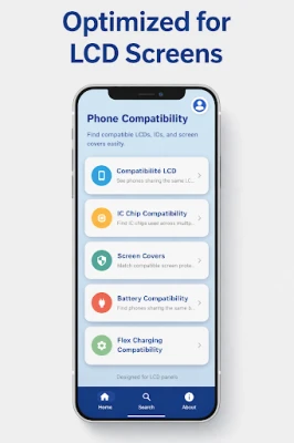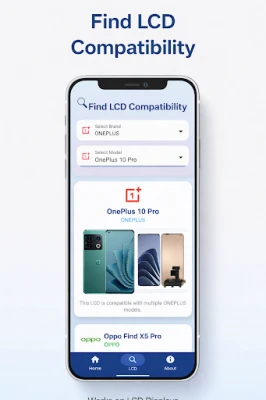 LCD COMPATIBLE är det ultimata verktyget för mobiltekniker, verkstäder och återförsäljare. Upptäck snabbt kompatibla LCD-skärmar, IC-chip, flexkablar och batterier för tusentals telefonmodeller från ledande märken. Få exakta resultat och effektivisera ditt arbete utan gissningar.
