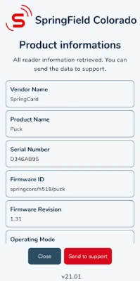 SpringField Colorado förenklar hanteringen av SpringCards smarta läsare. Upptäck snabbt vilken firmware som är installerad och om en uppgradering behövs. Svep din Android-smartphone över enheten för att omedelbart få all nödvändig information för din SpringCard-läsare, som RDR eller FunkyGate. Perfekt för fältarbete.