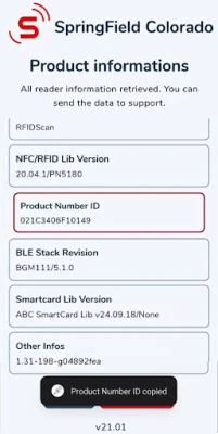 SpringField Colorado är din oumbärliga följeslagare för att snabbt och enkelt få fram detaljerad information om dina kompatibla enheter. Utvecklad av SpringCard, omvandlar denna app din Android-smartphone till ett kraftfullt diagnostikverktyg som omedelbart avslöjar väsentliga data. Få omedelbar insikt i enhetens tillverkare, produktnamn och unika firmware-ID. Applikationen ger dig en klar överblick över enhetens identitet, vilket är avgörande för effektiv hantering och underhåll.