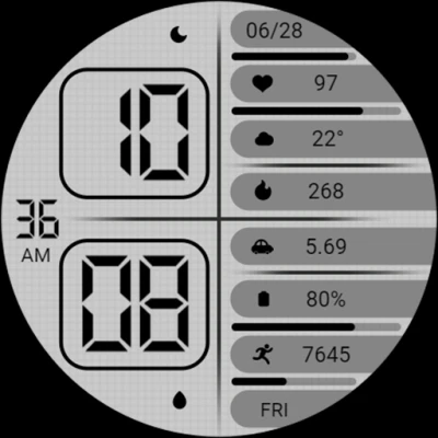 Upptäck en dynamisk urtavla som förvandlar din smartklocka till en intuitiv kontrollpanel för din vardag. Denna eleganta lösning är skräddarsydd för att ge dig omedelbar tillgång till viktig information direkt från din handled. Med en genomtänkt design som balanserar estetik med funktionalitet, kan du enkelt övervaka allt från tid och hälsovärden till dina personliga aktivitetsmål. Förhöj din användarupplevelse med en display som är lika informativ som den är stilren, och som alltid håller dig uppdaterad med det som betyder mest för dig.