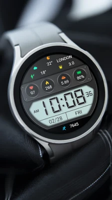 Upplev en helt ny nivå av personlig anpassning och funktionalitet direkt på din Wear OS-klocka. Denna moderna urtavla är framtagen för att sömlöst integrera stil med praktisk information, och förvandla din smartklocka till en ännu mer oumbärlig del av din vardag. Med en intuitiv design presenteras all viktig data tydligt och elegant, precis där du behöver den som mest. Det är en perfekt blandning av estetik och nytta, skräddarsydd för den medvetne användaren som värdesätter både form och funktion i sin handledsenhet.